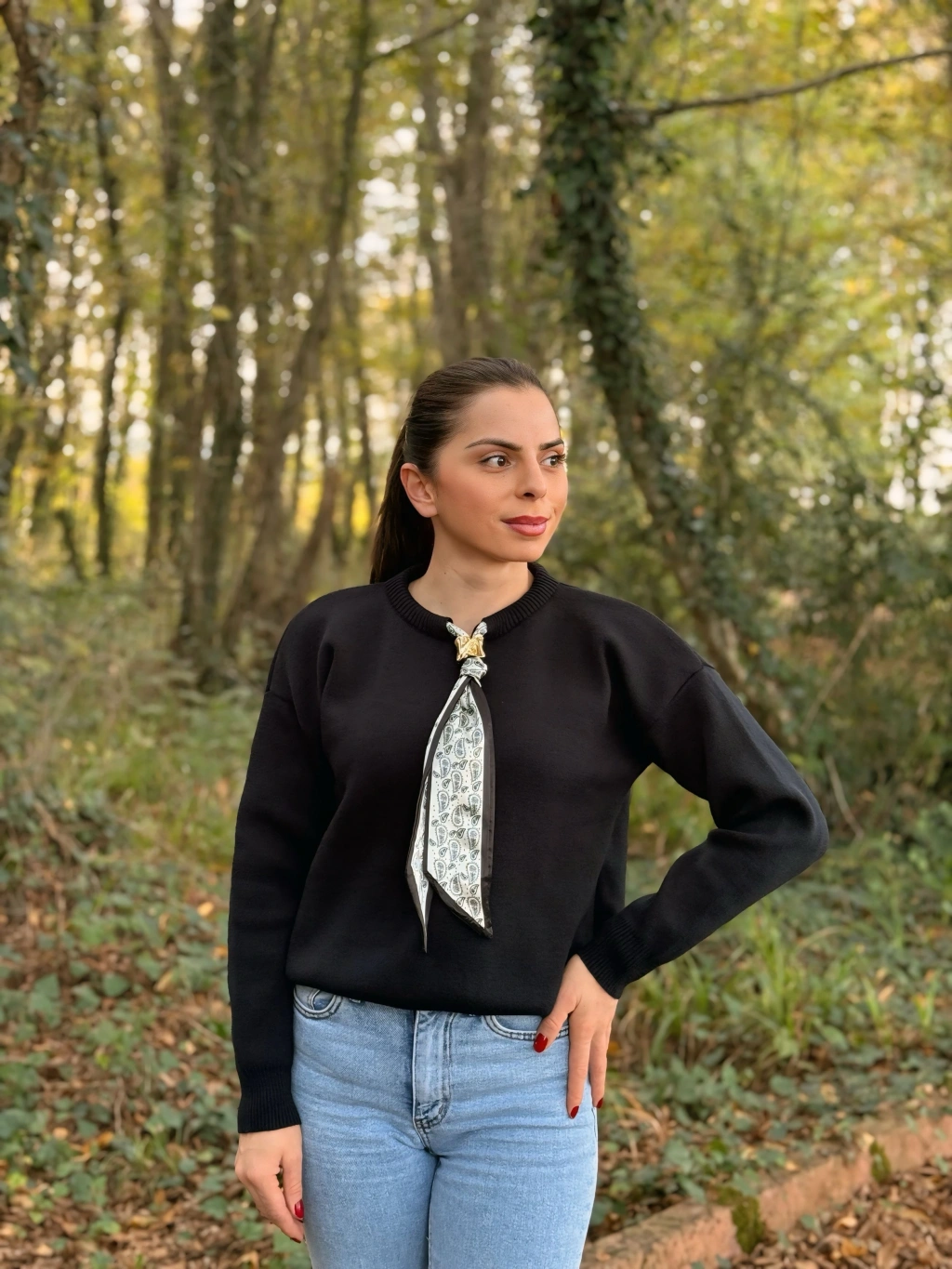 Fular detay Polo yaka kazak siyah