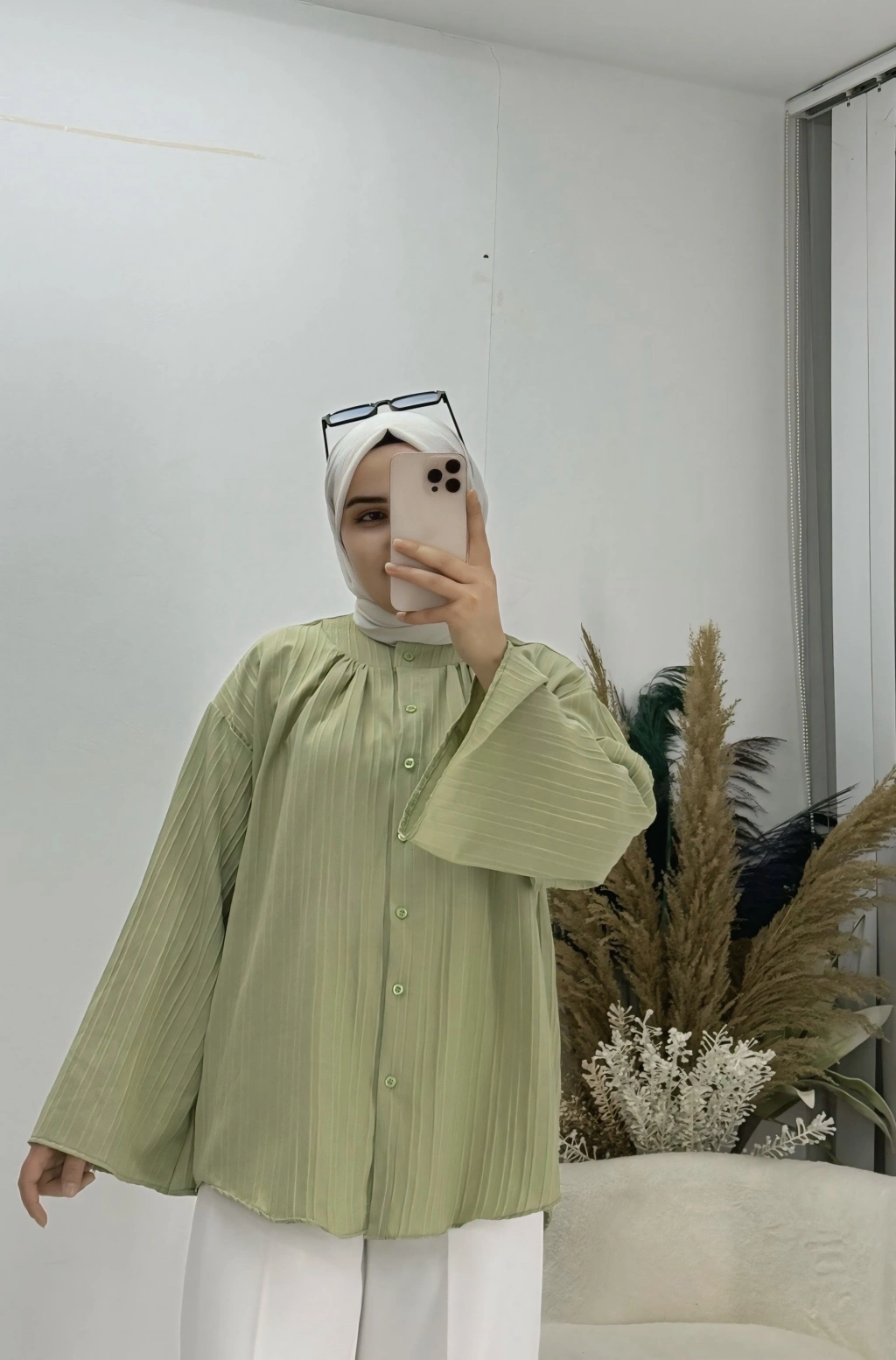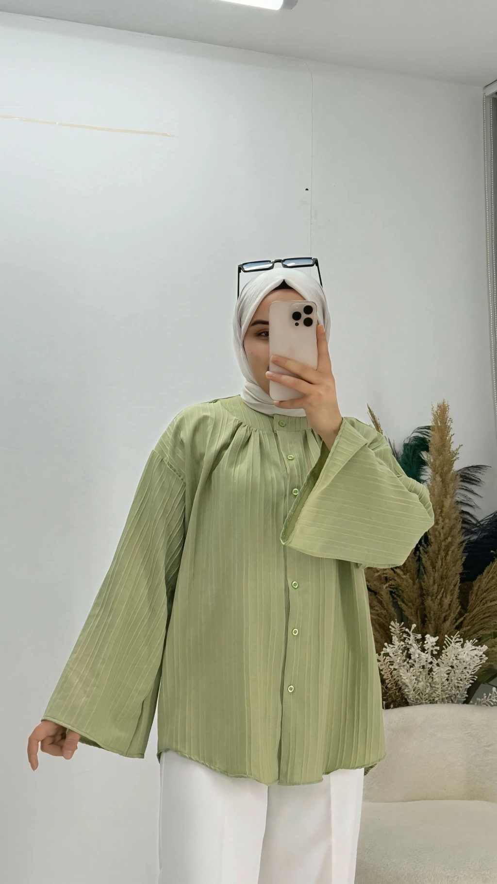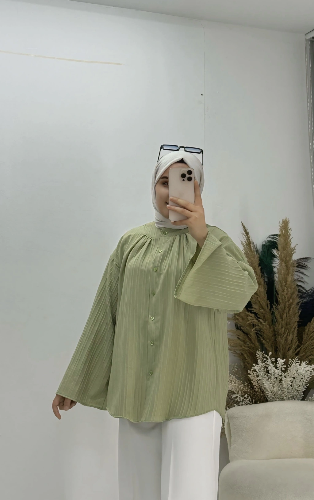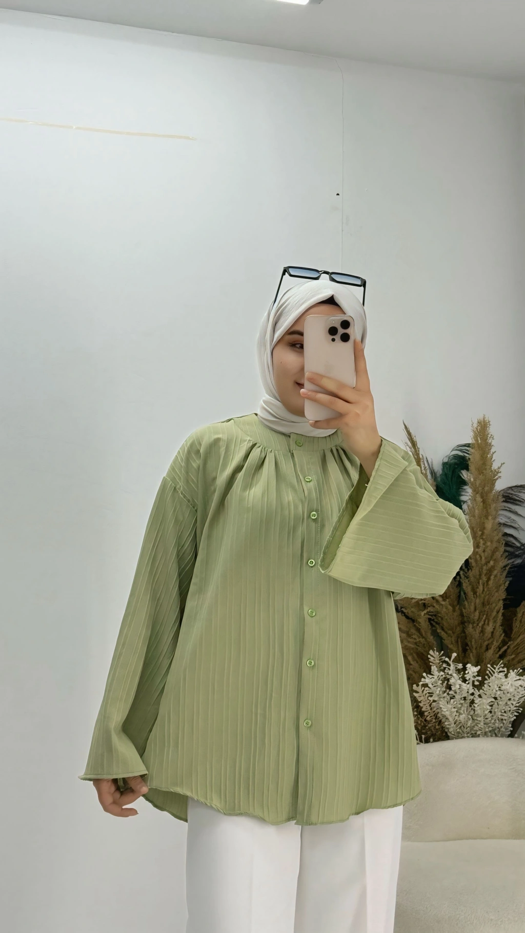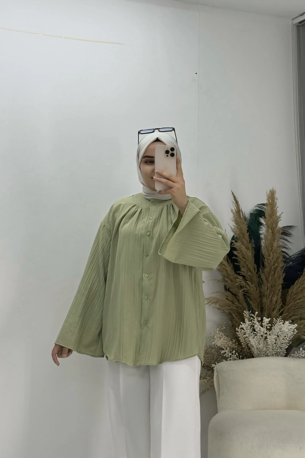 Geniş Kol Piliseli Gömlek yağ Yeşil