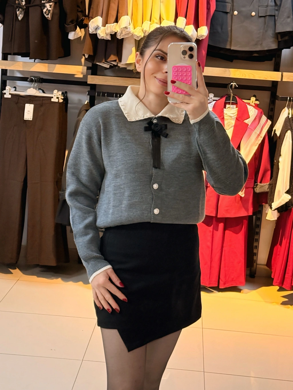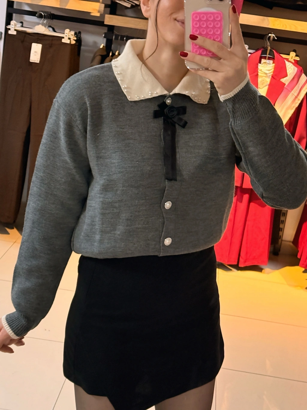 İnci taşlı Polo yaka kazak gri
