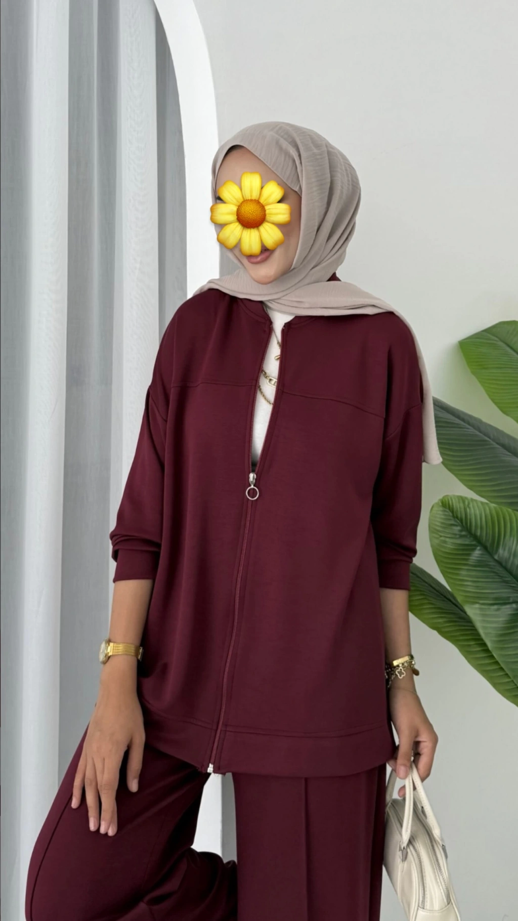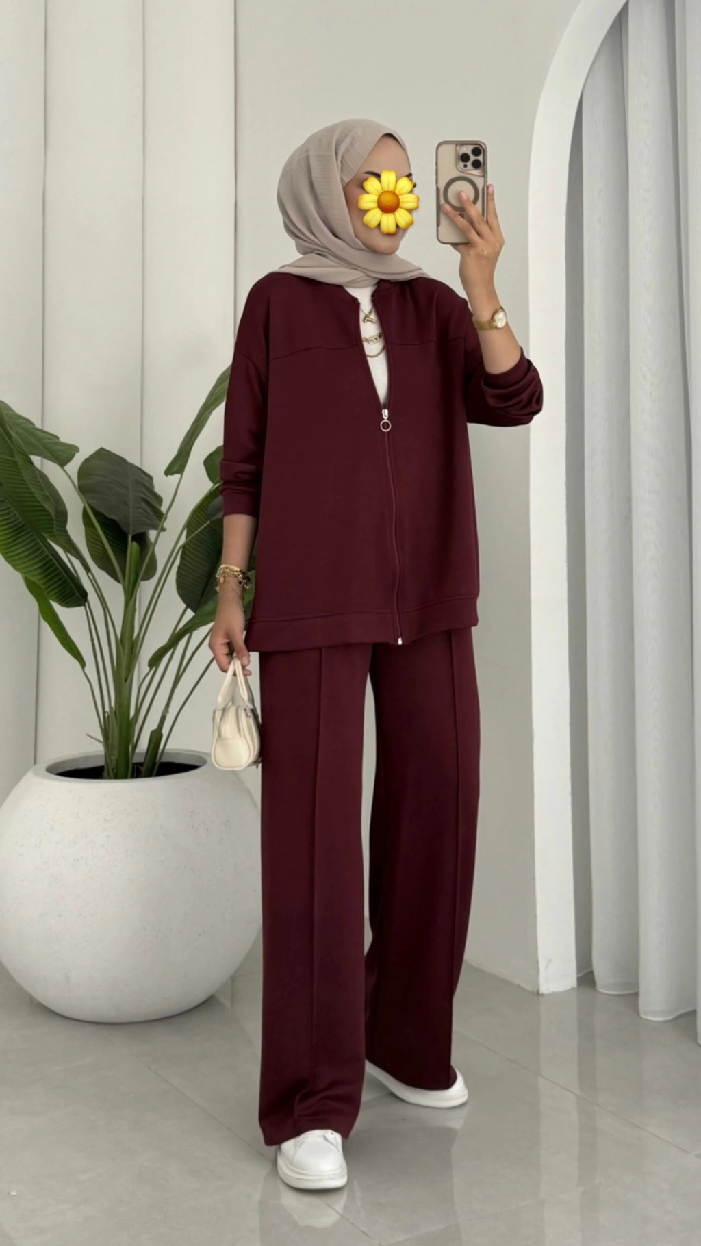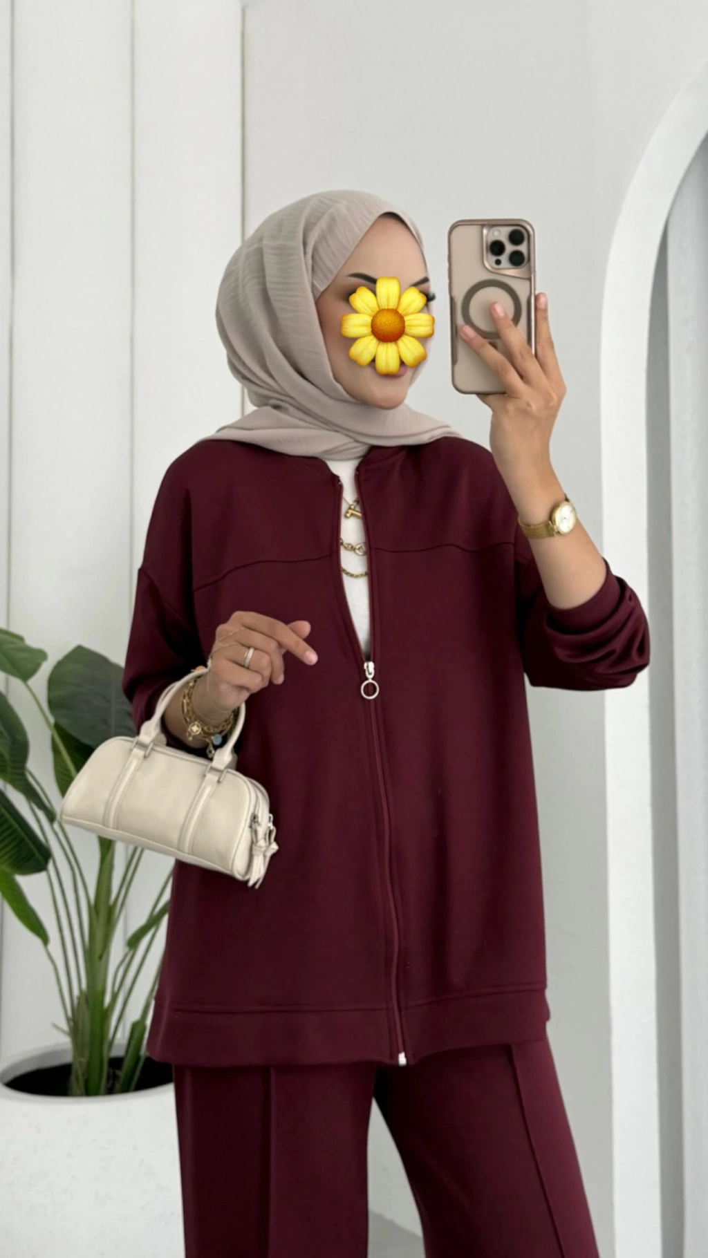 Yelekli Fermuarlı Üçlü Takım Bordo