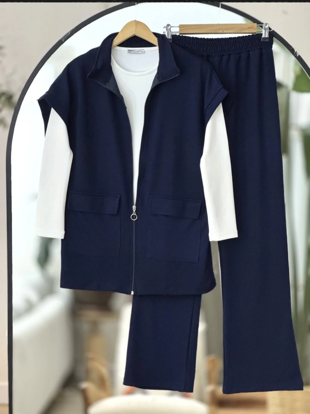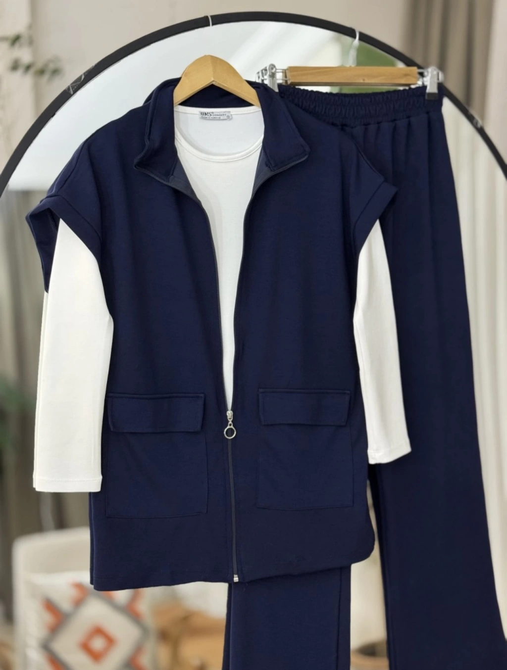 Yelekli Fermuarlı Üçlü Takım Lacivert